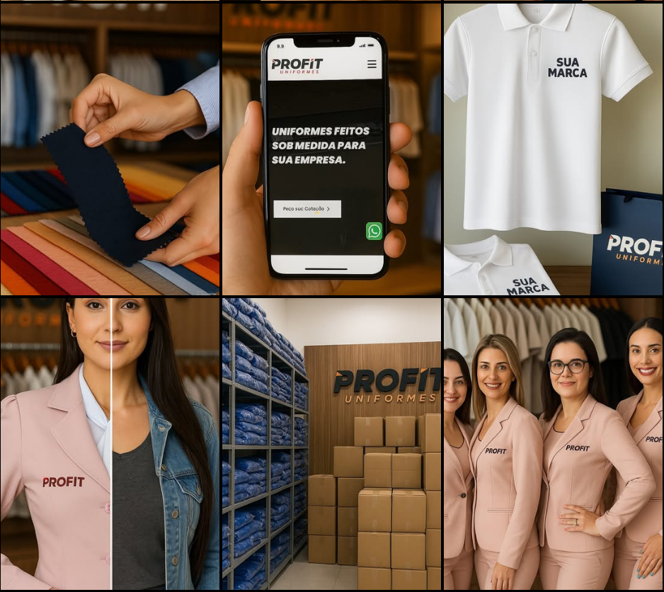 Somos a ProFit Uniformes, uma empresa que nasceu da amizade e da vontade de oferecer algo diferente no mercado de uniformes personalizados. Nossa motivação está em fazer parte da história de cada cliente, entregando produtos de altíssima qualidade, com design diferenciado e processos modernos que garantem agilidade, excelência e um atendimento consultivo. Nossa missão é ajudar empresas de todos os segmentos a vestirem seus times com conforto, profissionalismo e estilo, refletindo a identidade e os valores de cada negócio.